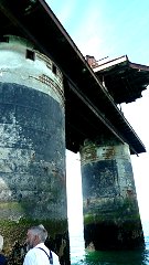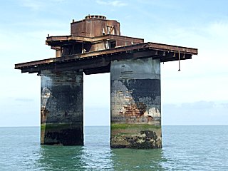 | Another curiosity is the 27-metre Nab Tower, situated on the Nab Rocks in the entrance to The Solent shipping channel to the east of Bembridge, Isle of Wight. Two towers were originally planned to be constructed at Shoreham in 1918 for placement in the Straits of Dover to protect shipping from U-boats, but only one was ever completed, due to the ending of WWI. It was, instead, used to replace the Nab lightship and was put into place on 12th September 1920, in a similar manner to the later Maunsell forts (but ending with a 3-degree tilt!). The 'lighthouse' was manned until 1983. |
