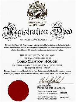 territorial waters. To date, no official agreement has been signed between Sealand and Britain regarding the resulting overlap in claimed jurisdiction but a general policy of dividing the area between the two countries down the middle has been unofficially followed. International law does not allow the claim of 'new' land by the simple extension of sea rights and so Sealand's sovereignty was still guaranteed. Under this law, neither 'country' can claim rights to any part of the other that falls within its 'new' boundary and it is to its credit that Britain has made no further attempts to take Sealand but still treats it as an independent State. Following a ruling by the DHSS, Prince Roy pays no British National Insurance during the time he spends on Sealand. There was another incident involving firearms in 1990 when warning shots were fired at a ship that had strayed too near Sealand. The crew of the ship subsequently made formal complaints to the British authorities but, despite Britain's severe prohibition of firearms, the government chose not to pursue the matter indicating that the Home Office still considers Sealand to be outside their umbrella of control. |