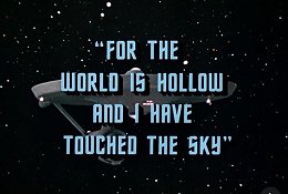 She tends to McCoy while Spock and Kirk are allowed to wander around, discovering that the asteroid is hollow and supports a self-contained world and its population. They get into a conversation with an old man who realises that they are different. He tells them that the people do not know they are living in a hollow sphere and how, when he was young, he climbed a high 'mountain' and discovered the fact for himself 'for the world is hollow and I have touched the sky'. Suddenly, something under the skin of his temple starts glowing and he falls dead at their feet.