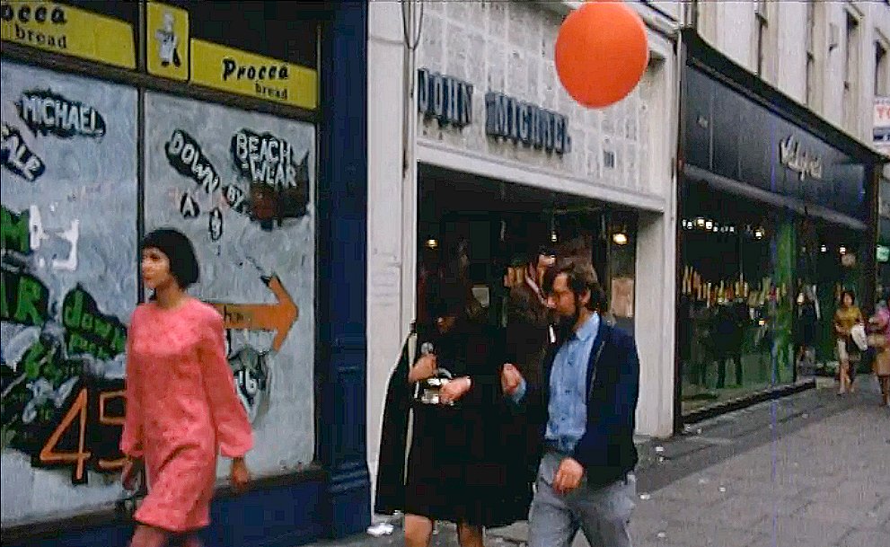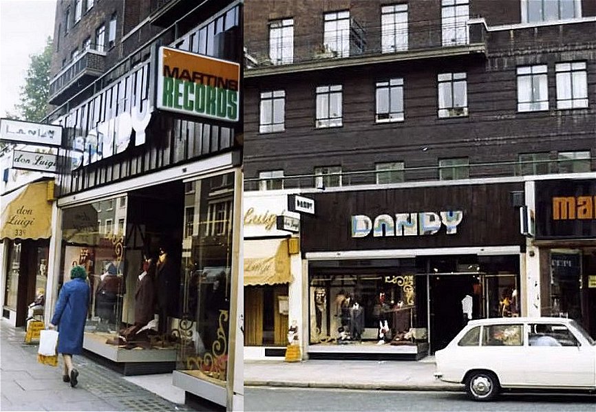 83 T.Carmichael wallpaper & paints c.1967 (visible in this 1939 picture) Later Downtown boutique c.1976 84 Fifth Avenue boutique 85 In 1939 to at least 1965 (1965 Advert) this was King's Road Garage, Taylor and Crawley service and repair and Ross Autowash Ltd. Later The Great Gear Trading Company (23rd July 1970) Tom Salter, who ran the 'Gear' boutique in Carnaby Street, was also involved in the Great Gear outlet with Robin Sutherland and David Stableford. It housed a number of establishments including, at various times, fashion 'shops' such as Marx, Tik and Tok's clothing shop, an outlet of 'Boy', Reflections restaurant , Jean Machine 2 (also at 161-163) and the Antenna hairdressers. A feature of the premises was a DJ booth 'cage' manned by drummer Rusty Egan. The Japanese fashion designer Yamamoto presented a fashion show there in May 1971 prompting David Bowie to ask him to design his costumes for the 'Aladdin Sane' shows. Jon Baker opened a fashion shop there called Axiom, in 1978, the same year as Stargazer started there. Entrances, occupants and numbers of 83-89 are somewhat confused over this period. (called The Great Gear Market 1980s). 86 House of Bewlay tobacconist and pipe shop. Racing driver Les Leston occupied the back of Bewlays c.1967 with a motor parts / gadget store. Later Not Known (street scene). 87 Orange Julius cafe Later Not Known Serge boutique c.1976 88 Just Looking c.1967 (Harry Finegold who also owned stop the Shop at 126) Lots of mirrors and loud music inhabited this boutique which, like the Drugstore, was designed by architects Garnett Cloughley Blakemore (who also designed the revolving restaurant at the top of the Post Office Tower). 89