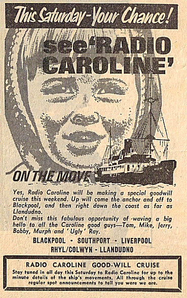 'Carmen', off the coast of Harwich, on June 21st. The operating costs of Radio Atlanta and Radio Caroline were not cheap as they both had to be supplied by service boats out of Brightlingsea or Harwich which, after being checked by UK Customs, ferried all their necessary provisions out to them including fuel, water, food, new record releases or recordings and, of course, regular staff changes and replacements. Some way had to be found to reduce costs and it made financial sense for the two stations to amalgamate. Talks between Allan Crawford and Ronan O'Rahilly, which had been more or less ongoing since before either station had gone on air and were hastened by pressure on the government from the music industry to outlaw them, resulted in the merger of Radio Atlanta and Radio Caroline being announced on July 2nd 1964. Radio Atlanta officially ceased to exist at 8pm on that day when the 'Mi Amigo' started transmitting as 'Radio Caroline South' from its existing location off Frinton-on-Sea. The 'Caroline' was moved from her position off Felixstowe to an anchorage off Ramsey, Isle of Man, to cover north-west England, northern and southern Ireland as Radio Caroline North with the station actually continuing to broadcast, as Radio Caroline North, whilst en route, courtesy of the only two DJs on board during the trip, Tom Lodge and Jerry Leighton. A minor curiosity occurred on July 5th when a station identifying itself as 'Radio Free Yorkshire' broadcast fleetingly in the Bridlington area. It was apparently the idea of, and operated by, would-be councillors to show 'the dangers of pirate radio' and possibly holds the distinction of being the shortest-lived transmitting pirate radio station, although there were quite a few other serious contenders for this less than prestigious title. One of these was Radio Red Rose which began broadcasting for a few hours on July 12th from the steamship 'Red Rose', anchored about 20 miles off Liverpool, and was financed by a consortium of Liverpool club owners. The exact duration and fate of this station are unknown but some accounts state that it only lasted the one day. The following day, July 13th, Radio Caroline North commenced broadcasting regular programmes on 197m between 6am and 9pm from its new permanent location off the Isle of Man. Shows included Tom Lodge's 'Rave Party', Jim Murphy's 'Midnite Surf Party' and Don Allen's 'Country & Western Jamboree'. |